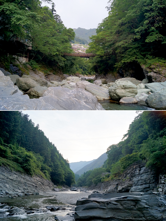 上: 祖谷川と祖谷のかずら橋、落合集落